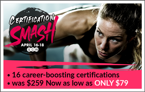 Get Certified for as low as $79 at Certification Smash! This one-weekend Certification event offers 16 nationally recognized Certifications with CECs from SCW, ACE, AFAA, NASM, AEA & ACSM.